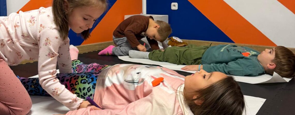 Podczas jednej z ostatnich lekcji dzieci z poziomu B (5-latki) odrysowywały swoje sylwetki, ucząc się, gdzie jest lewa i prawa strona, co to znaczy z przodu, z tyłu, nad, pod.